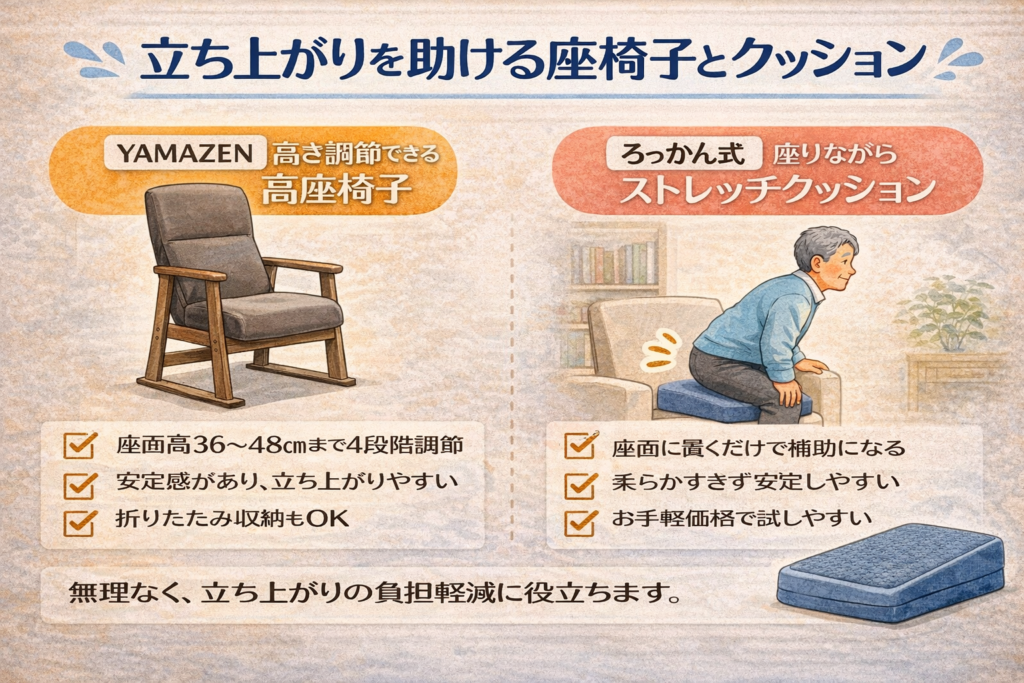立ち上がりを楽にするために、椅子とクッションを見直してみましょう